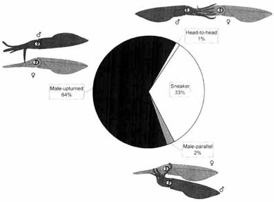 Percentage of all matings of each of the four mating types (male-upturned, head-to-head, male-parallel, or sneaker) identified in Sepioteuthis australis, with illustrations of the three mating types between paired individuals.