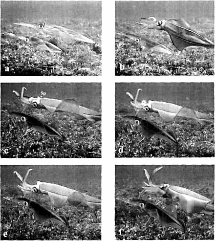 Six-frame sequence of “male-upturned mating” behavior in Septoteuthis australis. The male (top) swims into position over the female (bottom, a). The male then rotates into the upside down position (b) and gathers spermatophores (Sp) from the funnel with the left 4th hectocotylized arm (c). The hectocotylized arm then moves down the right 4th arm that is positioned in the buccal area of the female (d) and and deposits spermatophores in this area (e). Copulation is complete, and the male rotates back to the normal swimming position (f). Total time elapsed = 3s.