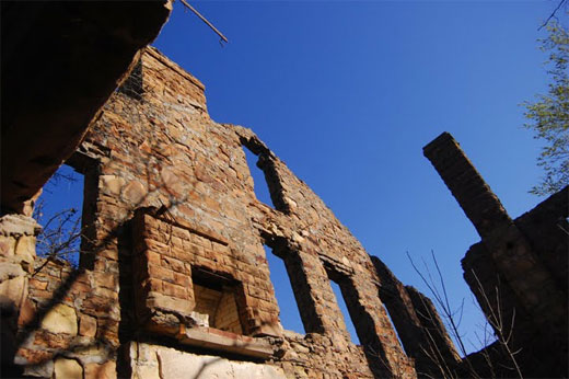 As we move closer, I see lichen growing on the walls that is so vivid in color I at first mistake it for paint. I have never seen anything like it, and I desperately wish I had a black light. Around back, we discover the semi-collapsed stables that presumably once held horses. Someone has spray-painted Turn Back or Die on one of the walls. We don’t turn back, and we don’t die. Later, in the yard, we find a dead cat (at least I think it’s a cat; it could be anything) floating in an open well of some kind. The smell doesn’t reach far, but as I approach, it almost doubles me over. Paul snaps a picture, and I turn the corner. Not what I came to see.
