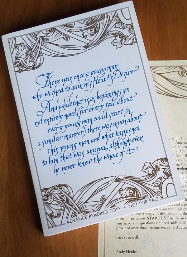 Items that have been donated by members include signed ARCs of Stardust (pictured) and Fragile Things by Neil Gaiman, Weaveworld by Clive Barker, and The Postman by David Brin, and even a pair of official Game of Thrones direwolf plushies!