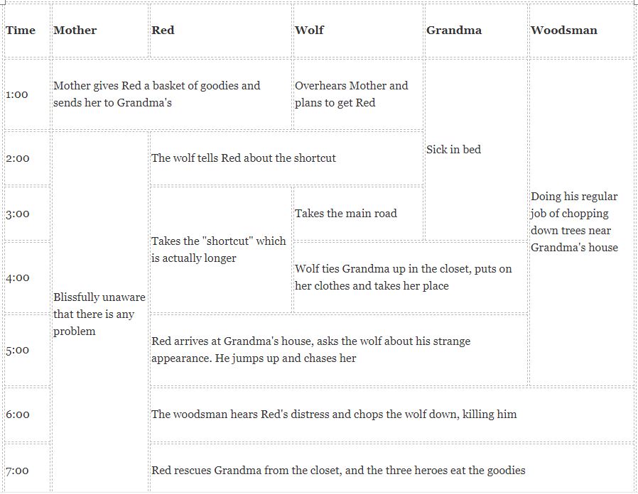 Create a table with a vertical dimension of time or progression, and a horizontal dimension of characters, and fill in the actions from each character’s table. Merge cells when two or more of your characters are in the same scene. This helps you to see not only how characters interact, but what offstage characters are doing.