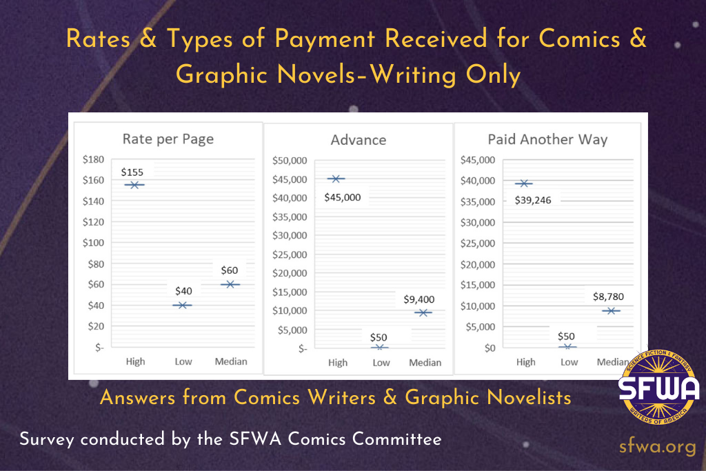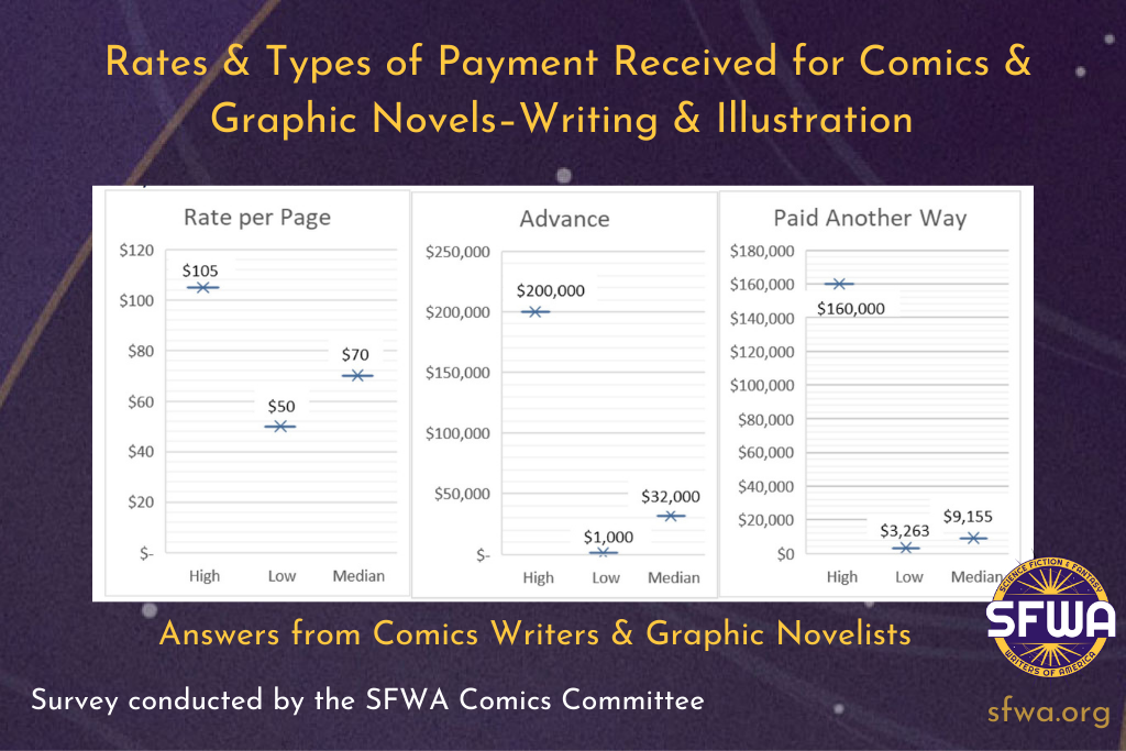 Alison Wilgus, Comics Committee chair, said, “Our results illustrate that while comics and graphic novel publishing is robust, many publishers are unfortunately still paying far below what is considered to be a minimum professional rate, highlighting the need to push for higher standards of pay. Going forward, this data will help us make informed and effective decisions as to how SFWA can best meet the needs of its new members from the comics community. I’m proud of the work the committee has done to date, and excited for what the future holds!”