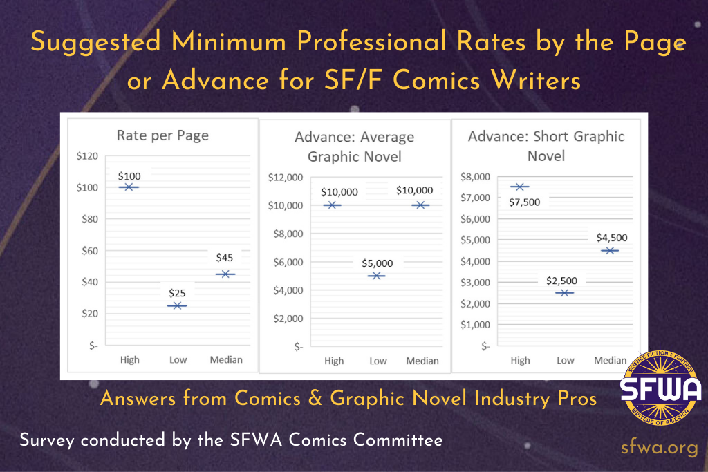 SFWA’s Comics Committee has announced the results of two surveys they’ve conducted to document current industry norms for advances and per-page rates for the work of comics writers and graphic novelists. The reports can be downloaded here: