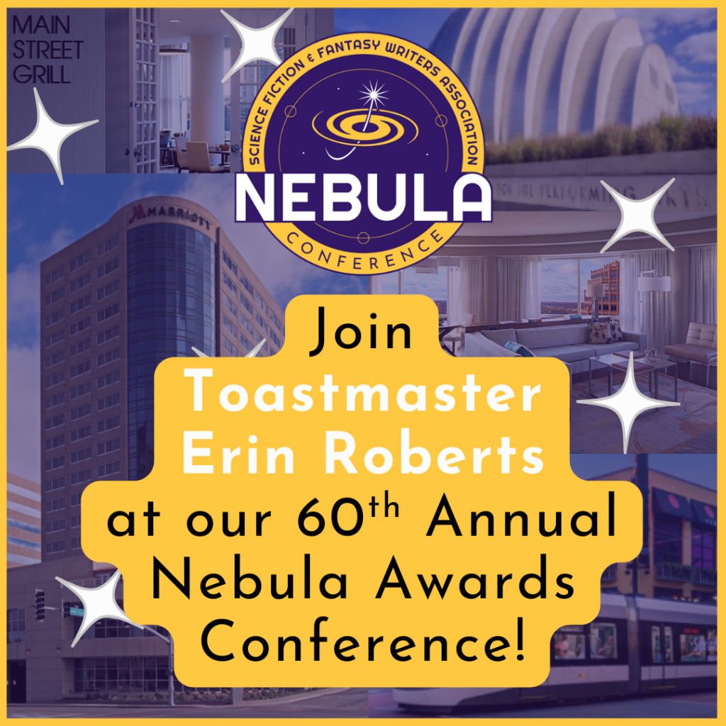 Toastmaster Erin Roberts will be leading the celebrations for us during our Nebula Awards Ceremony, which will be held during our conference from June 5–8, 2025 in Kansas City, Missouri. Registration for the conference is now open here. We hope you’ll join us in weaving one heck of a tale from our last year in science fiction and fantasy, and help us to usher in the next chapter of SFWA’s story together.