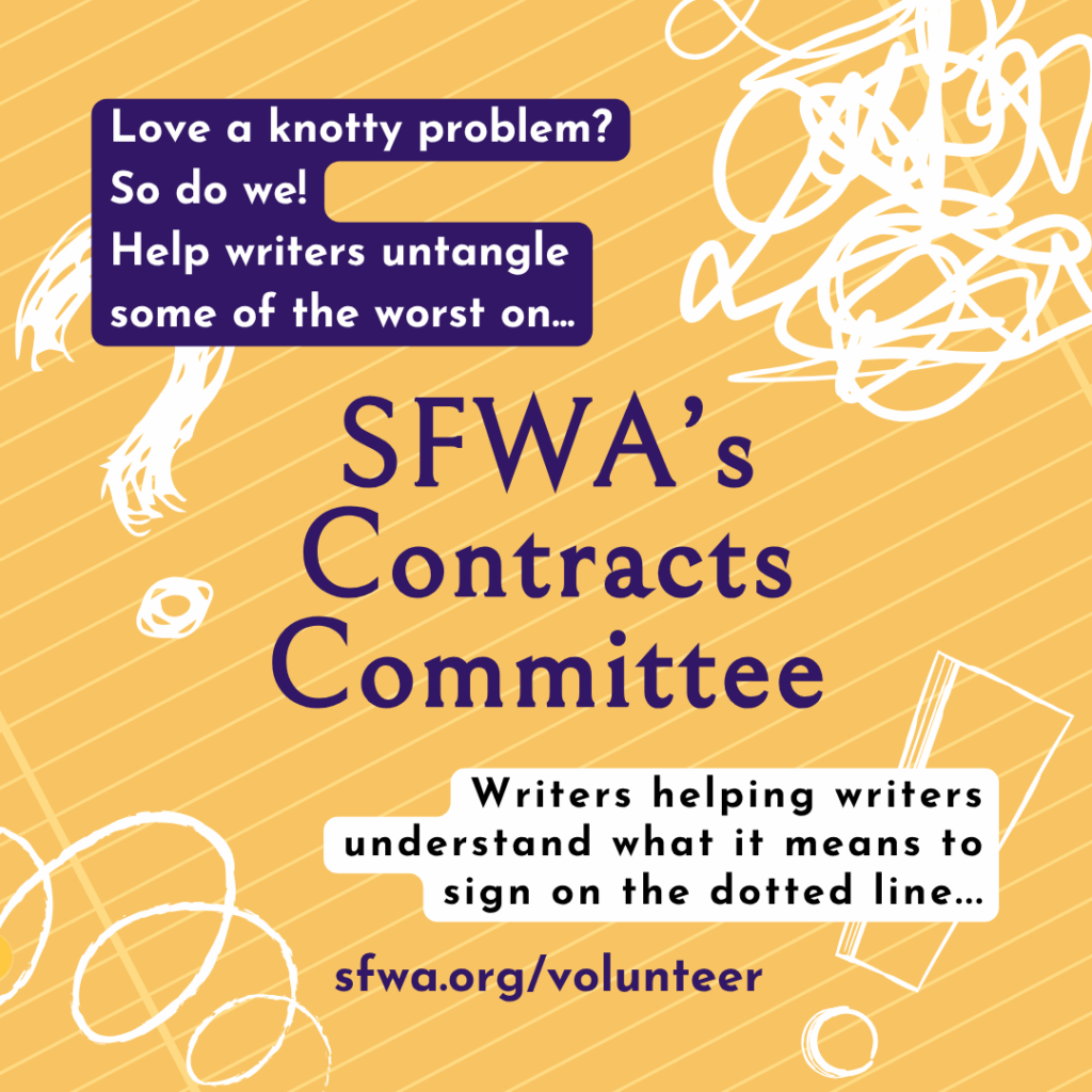 Contracts Committee: The Contracts Committee is looking for volunteers for 1–2 hours per week. Experience with a variety of publishing contracts is a must. Formal legal training is helpful. Duties will include participating in committee subforum discussion and helping to write model contracts, contract alerts, and blog posts.