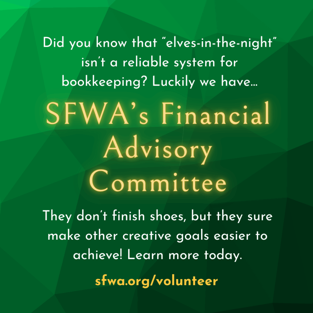 Financial Advisory Committee: Duties include reviewing monthly and annual financial statements, budgets, and asking questions when appropriate. Sometimes the committee also weighs in on policies for good fiscal management, sending their majority opinion to the Board. The time commitment for this volunteer position is low: typically an hour or two per month to review and reply to email about various financial documents. Committee members should have background education or experience in Not For Profits (like SFWA) in the following areas: accounting, tax, or legal. Individuals with a strong background in finance should send details to be considered.