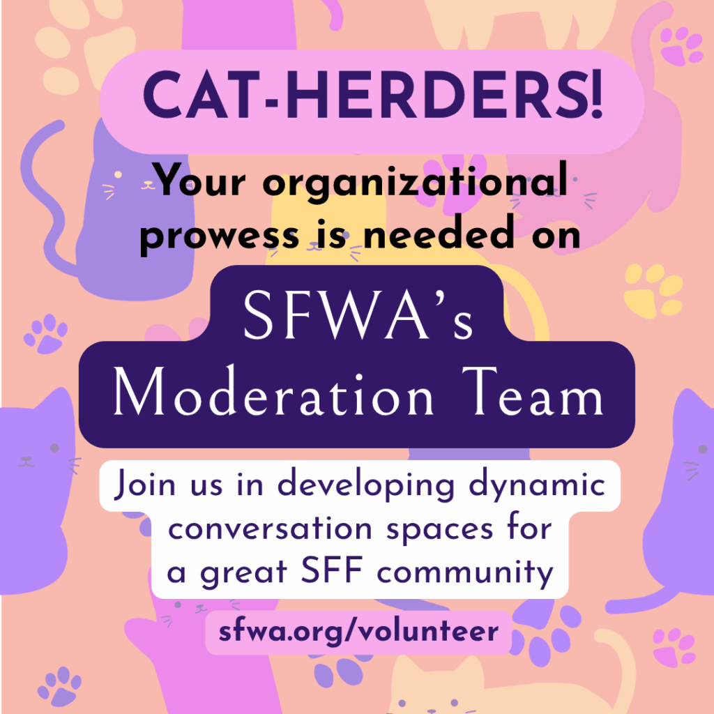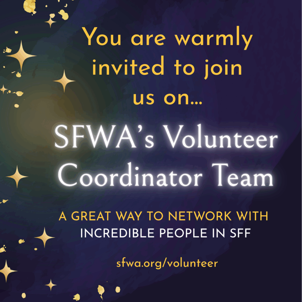 If you’re looking to join our team, we’d be thrilled to meet you. Many people volunteer to connect with fellow creators, acquire new skills, sharpen old ones, and contribute to their community. Most volunteer postings are for SFWA members, because these aren’t just passive positions. When you volunteer at SFWA, you’re making the fullest use of your membership to help us advance writer advocacy, defense, education, and outreach in the science fiction and fantasy genre. You get to be a part of the conversation.