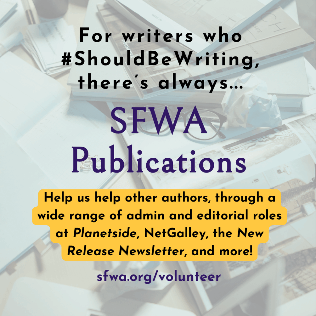 Publications: If you have experience with administrative and editorial tasks, consider joining SFWA Publications! Our Planetside Crew is currently full at the moment, but we have many other programs running through SFWA Publications, including our New Release Newsletter, NetGalley Partnership Program, BookFunnel Promotions Program, upcoming Games & Comics Quarterly, upcoming SFF Teaching and Library Resources Initiative, and Featured Book Service. We also welcome general volunteers looking to grow their skills in a variety of design and publishing pursuits. Training will be provided!