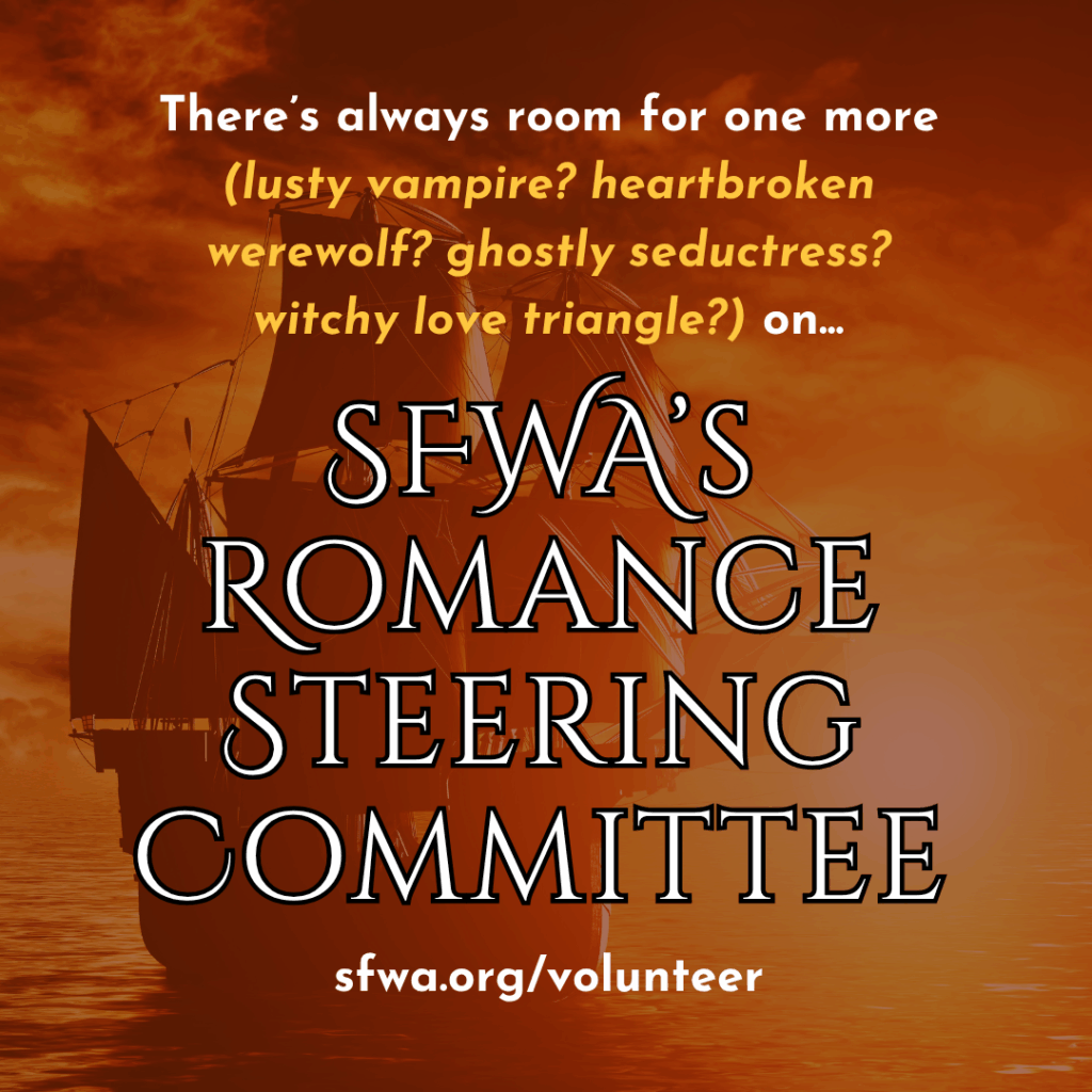 The Romance Steering Committee is looking for new members with ideas and enthusiasm for building a community of romantic SFF writers. Willingness to coordinate speakers for the Romancing SFF Meetups, hosting the monthly meetups, and taking part in the romantic-sff SFWA Discord channel are our greatest needs at the moment. We also welcome ideas for additional ways the committee can serve our membership and encourage romantic SFF writers to join SFWA.