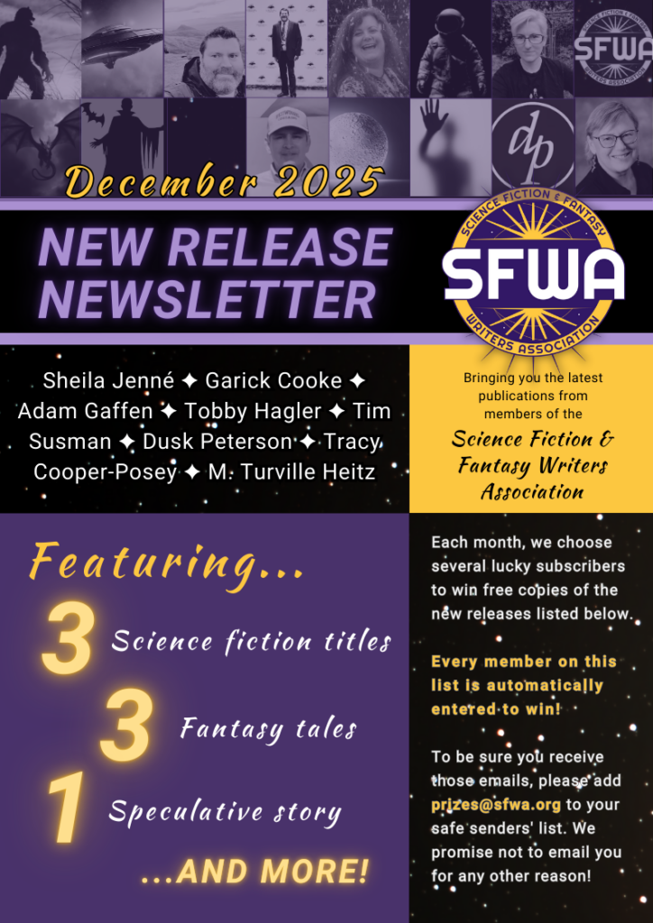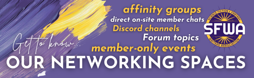 Please keep sending your events to communications@sfwa.org with “Singularity” in the subject line. If you would like your crowdfunding campaign included on this page and in our dedicated #crowdfunding Discord channel, send us those details, too. Note: SFWA posts these campaign links as a courtesy, not an endorsement, and work may be removed from the program if a breach of professionalism (e.g., genAI use in art or text materials) is involved.