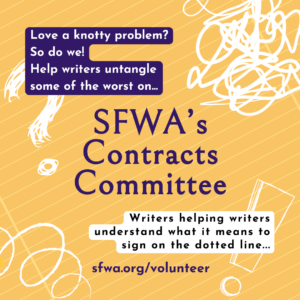 One of the best parts of being an accomplished creator is being able to give back to your community. If you have ever chosen to do so through SFWA, thank you. If you are doing so right now? AMAZING. You’re the best! And if you would like to start volunteering, we have a series of open calls available with our sign-up form here.